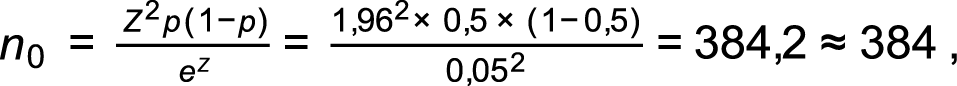 где n0 – объем выборки, Z – значение стандартизованной нормальной распределенной случайной величины, соответствующее генеральной вероятности (при доверительном уровне, равном 95%, Z=1,96); p – доля успехов в генеральной совокупности (для исключения недооценки выборки принято значение 0,5, при котором произведение p(1 – p) максимально); е – допустимая ошибка выборочного исследования (принята за ±5%).