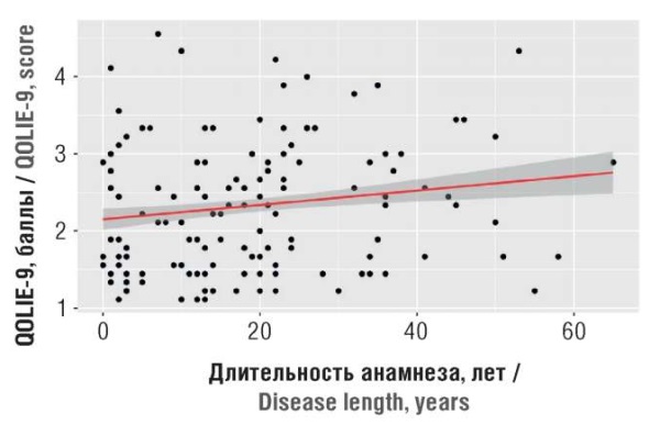Рисунок 2. График регрессионной функции, характеризующий зависимость оценки по опроснику QOLIE-9 от длительности анамнеза