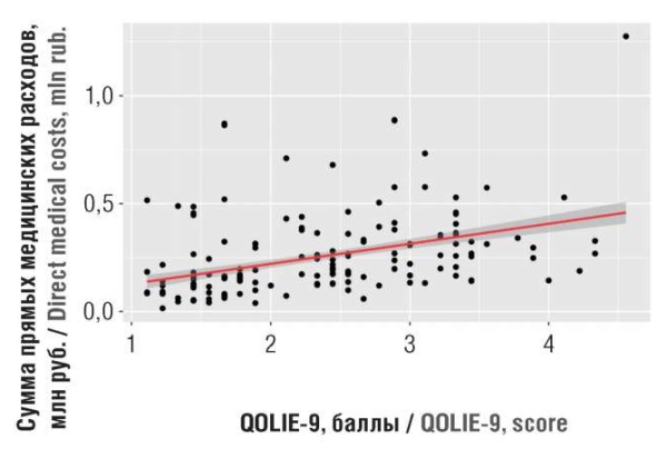 Результаты. Корреляционный анализ позволил выявить статистически значимые (p<0,05) факторы, влияющие на КЖ: место наблюдения, возраст пациента, длительность анамнеза, наличие группы инвалидности, уровень образования, трудовой статус, этиология заболевания, тип и частота приступов. При анализе связи суммы прямых медицинских расходов и результатов оценки по QOLIE-9 установлена прямая связь умеренной тесноты.
