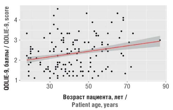Более молодой возраст пациентов ассоциируется с лучшим КЖ [14][15]. Это подтверждено и в нашем исследовании.