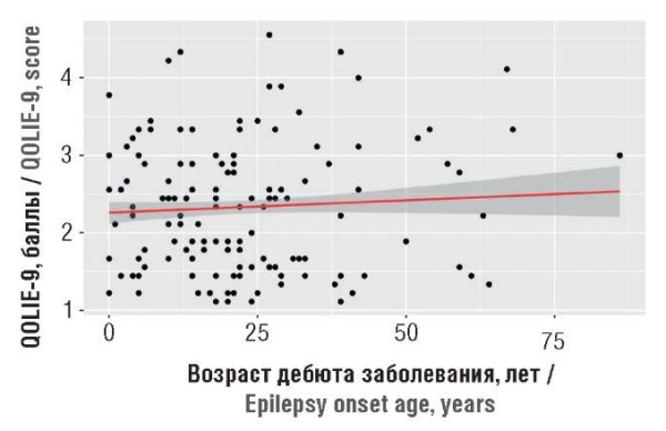 При увеличении возраста на 1 год следует ожидать повышения показателя QOLIE-9 на 0,014. Полученная модель объясняет 5,6% наблюдаемой дисперсии оценок по QOLIE-9. График регрессионной функции, характеризующий зависимость показателей QOLIE-9 от возраста, приведен на рисунке 3.